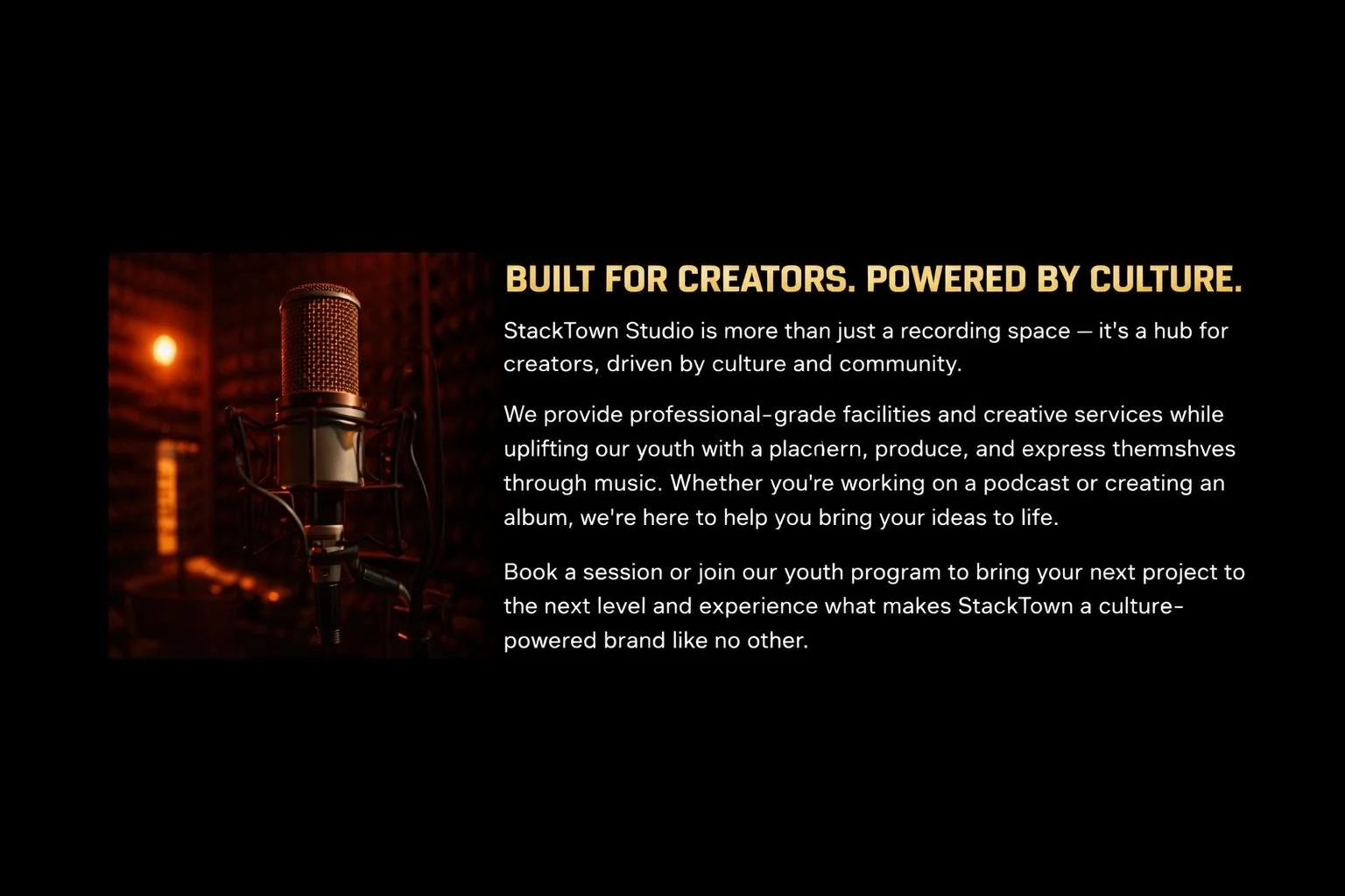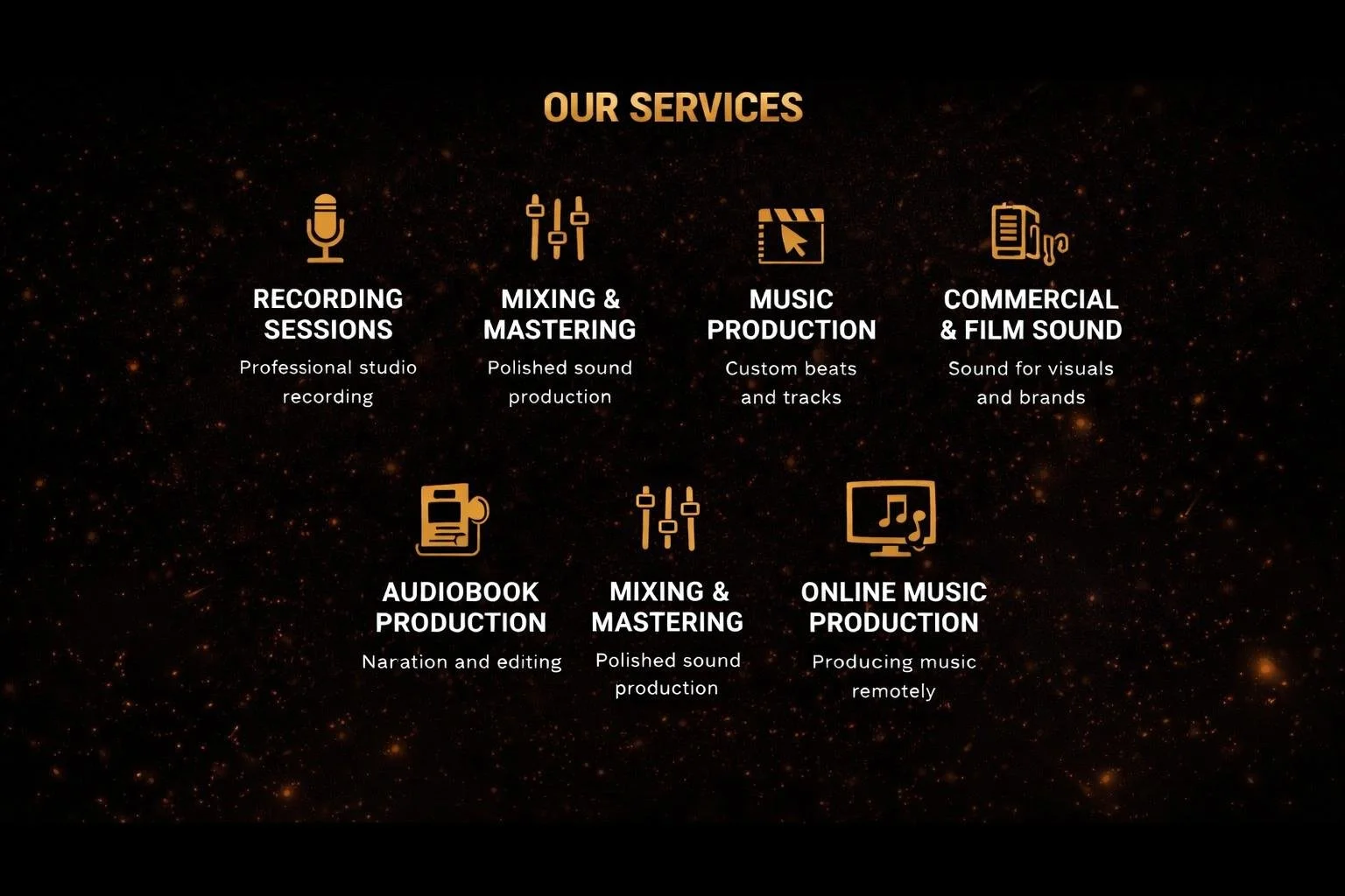 DeRecording Sessions 1 High-quality recording equipment 2 Clean, industry-standard sound 3 Comfortable creative space 4 Options with or without an engineer Perfect for singles, EPs, albums, and demos Mixing & Mastering 1 Crisp, balanced mixes 2 Industry-level mastering 3 Streaming platform ready sound 4 Attention to detail on every track Your sound, but elevated Music Production 1 Custom beat creation 2 Song arrangement & development 3 Full production support 4 Unique, industry-style sound Built for artists serious about their craft Online Services 1 Online mixing & mastering 2 Remote production services 3 Fast turnaround options No matter where you are, you can tap in Commercial & Creative Audio 1 Commercial audio production 2 Podcast recording & editing 3 Audiobooks 4 Film & soundtrack production Clean, professional sound for any projecscription text goes here